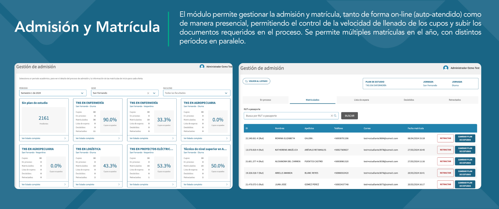 Los administrativos pueden gestionar estudiantes, docentes y funcionarios, además de dirigir procesos académicos como admisión, matrícula y titulación.