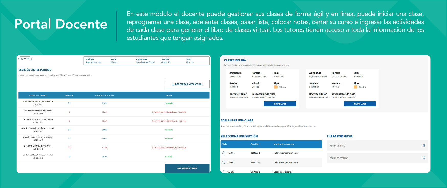 100% diseñado para potenciar la labor docente. Desde el portal docente, los profesores pueden gestionar sus asignaturas, planificar clases, registrar asistencia, evaluar y hacer seguimiento del avance académico de sus estudiantes en tiempo real.